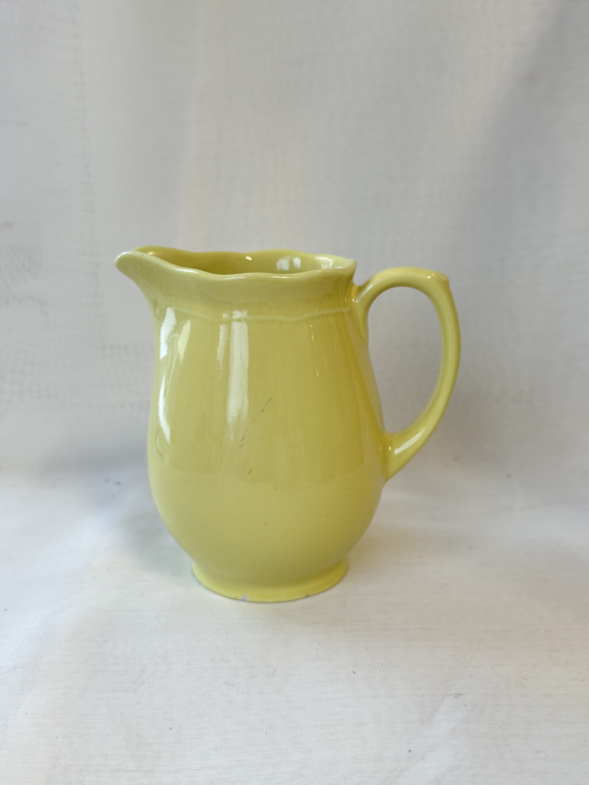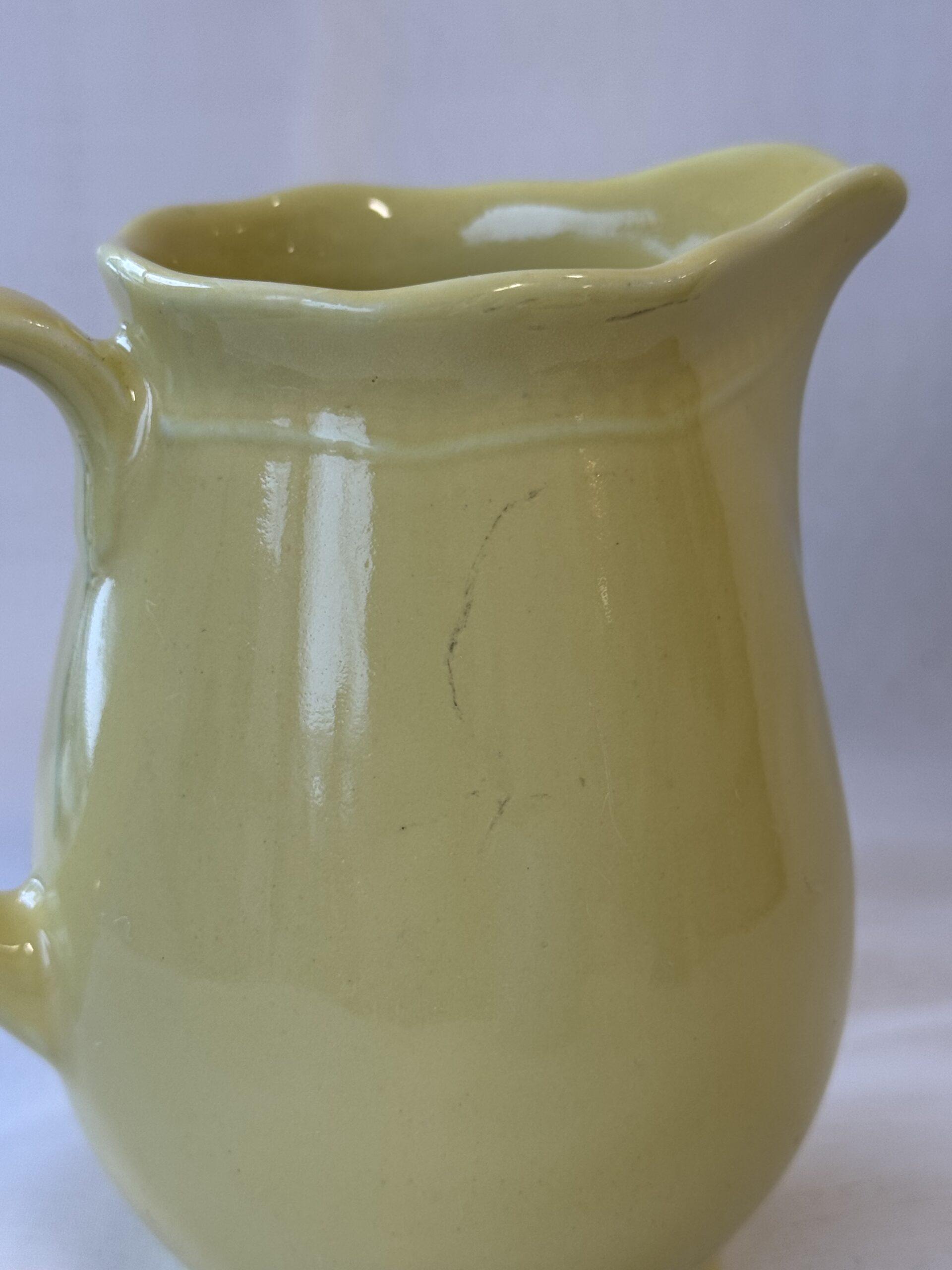 Arabia kermakko, keltainen väri. Kyljillä mustaa viirua, voisi lähteä pesussa. Korkeus 10,5 cm.