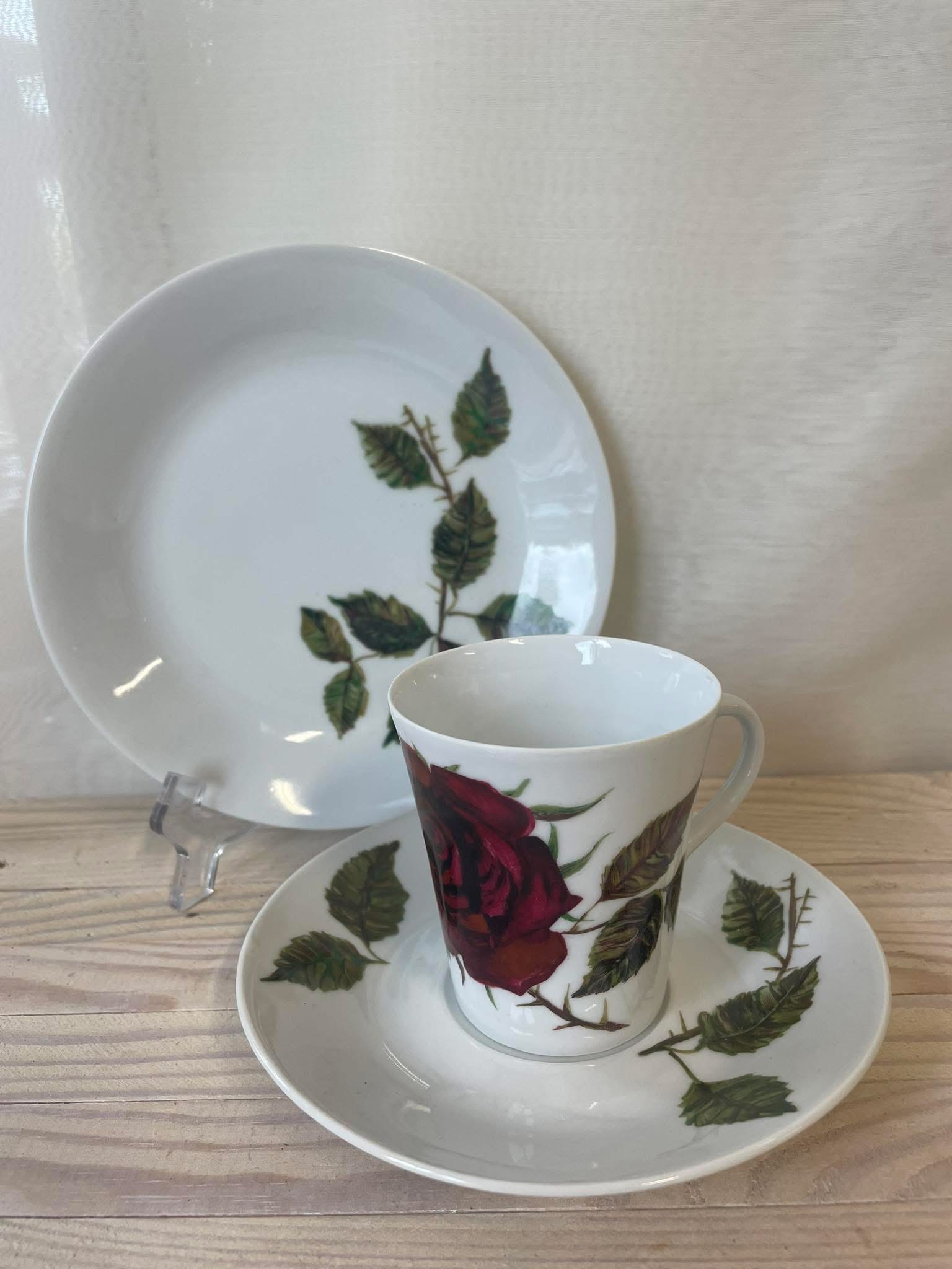 Arabia Ruusu kahvisetti, eli kuppi, asetti ja pullalautanen. Kupin korkeus 8 cm, asetin ø 14,5 cm, pullalautasen ø 17,5 cm.