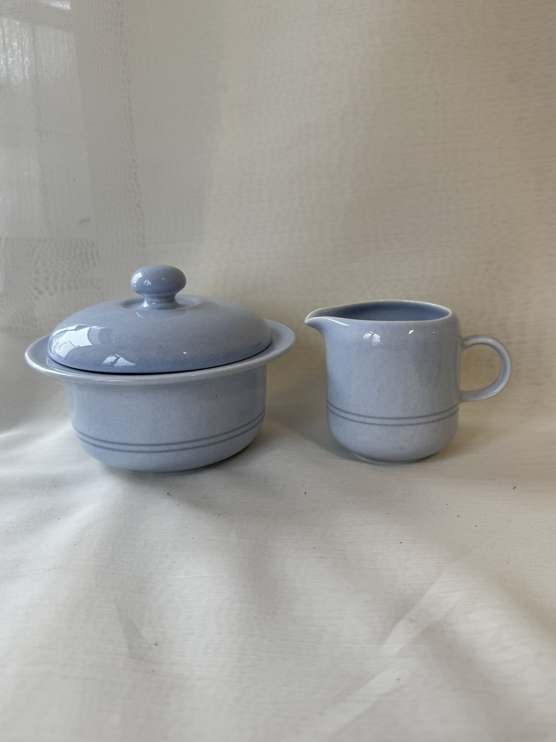 Arabia, Inkeri Leivo, Arctica sokerikko ja kermakko vaaleansinisenä. Sokerikon korkeus 9 cm, ø 13 cm. Kermakon korkeus 6,5 cm.