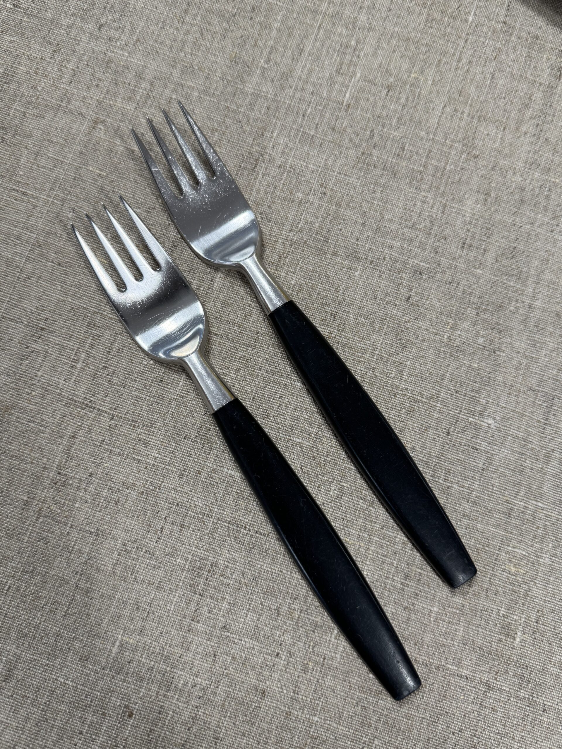Hackman Lion haarukka, bakeliittipää, suunnittelija Bertel Gardberg. Pituus 18 cm. Tuotannossa alunperin v. 1958, uusiotuotannossa v. 2010.