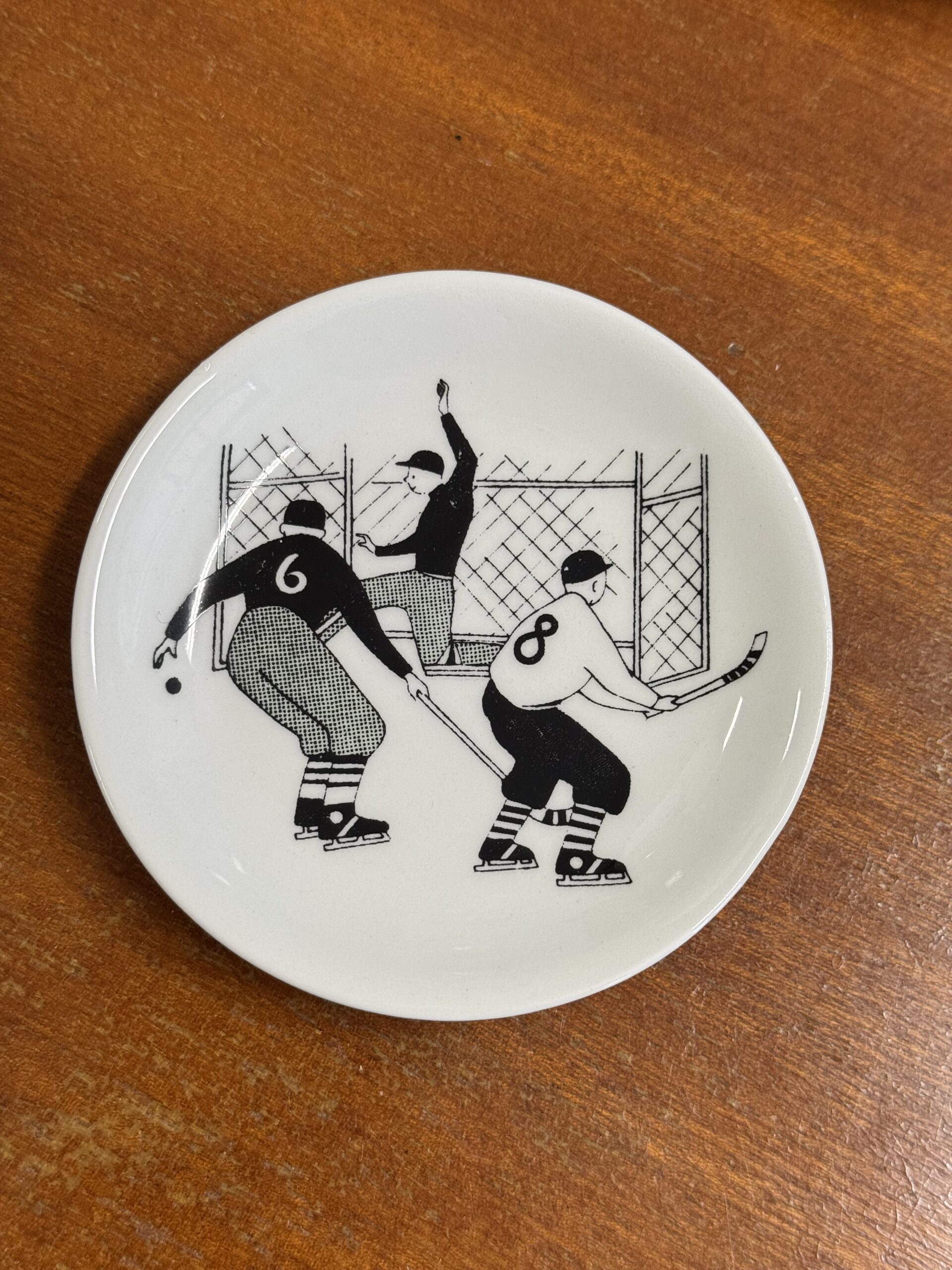 Arabia ja Raija Uosikkinen Harraste seinälautanen, valmistettu Suomessa vuonna 1967 pidettyjen jääpallon MM-kisojen muistoksi. Halkaisija 9,3 cm.