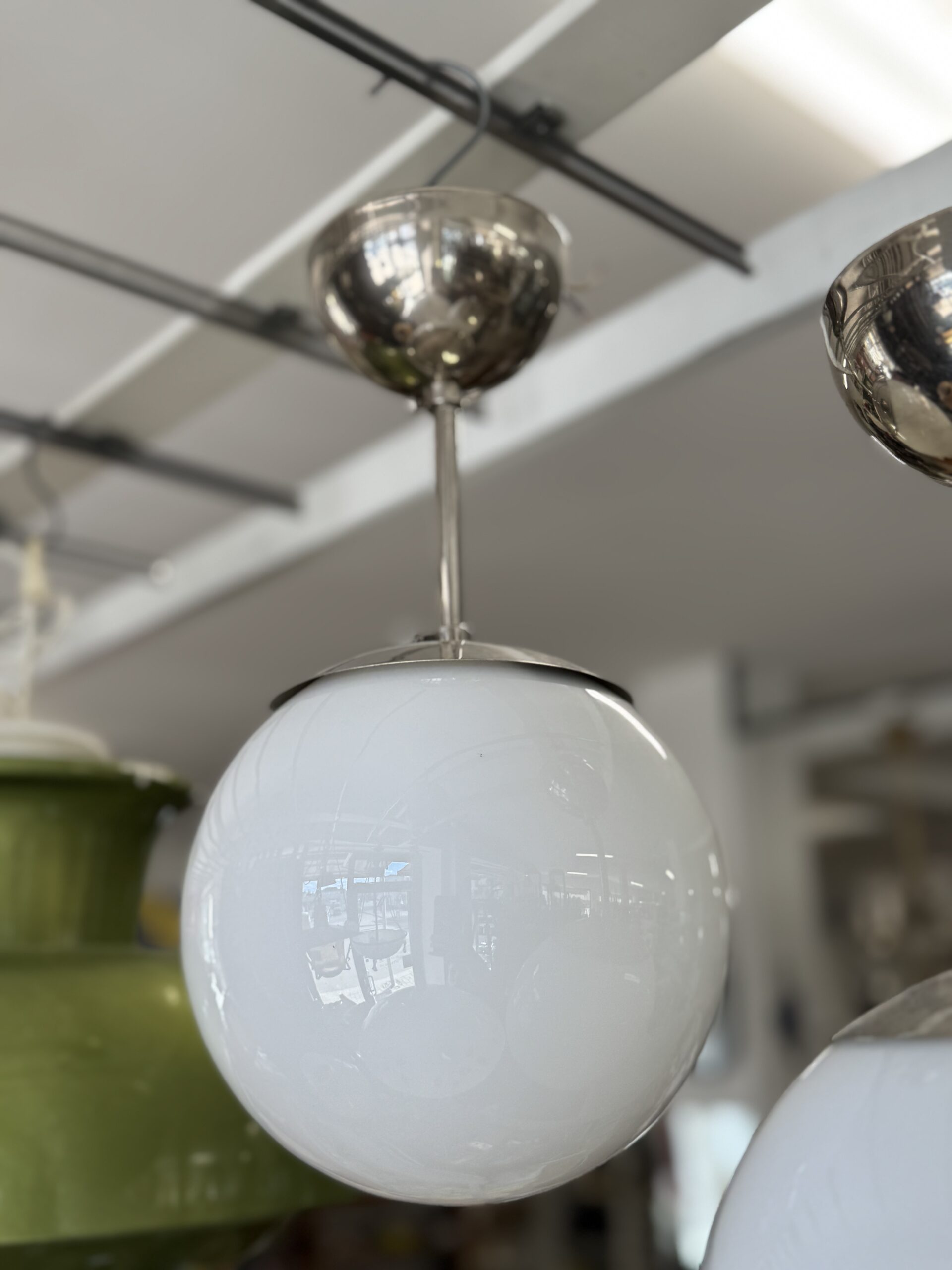 Itsun pallovalaisin 50-luvulta, halkaisija n. 16 cm. Metalliosa sisällä ja lasipallo eivät ole täydellinen pari, mutta pysyy paikallaan kun on rauhassa katossa.