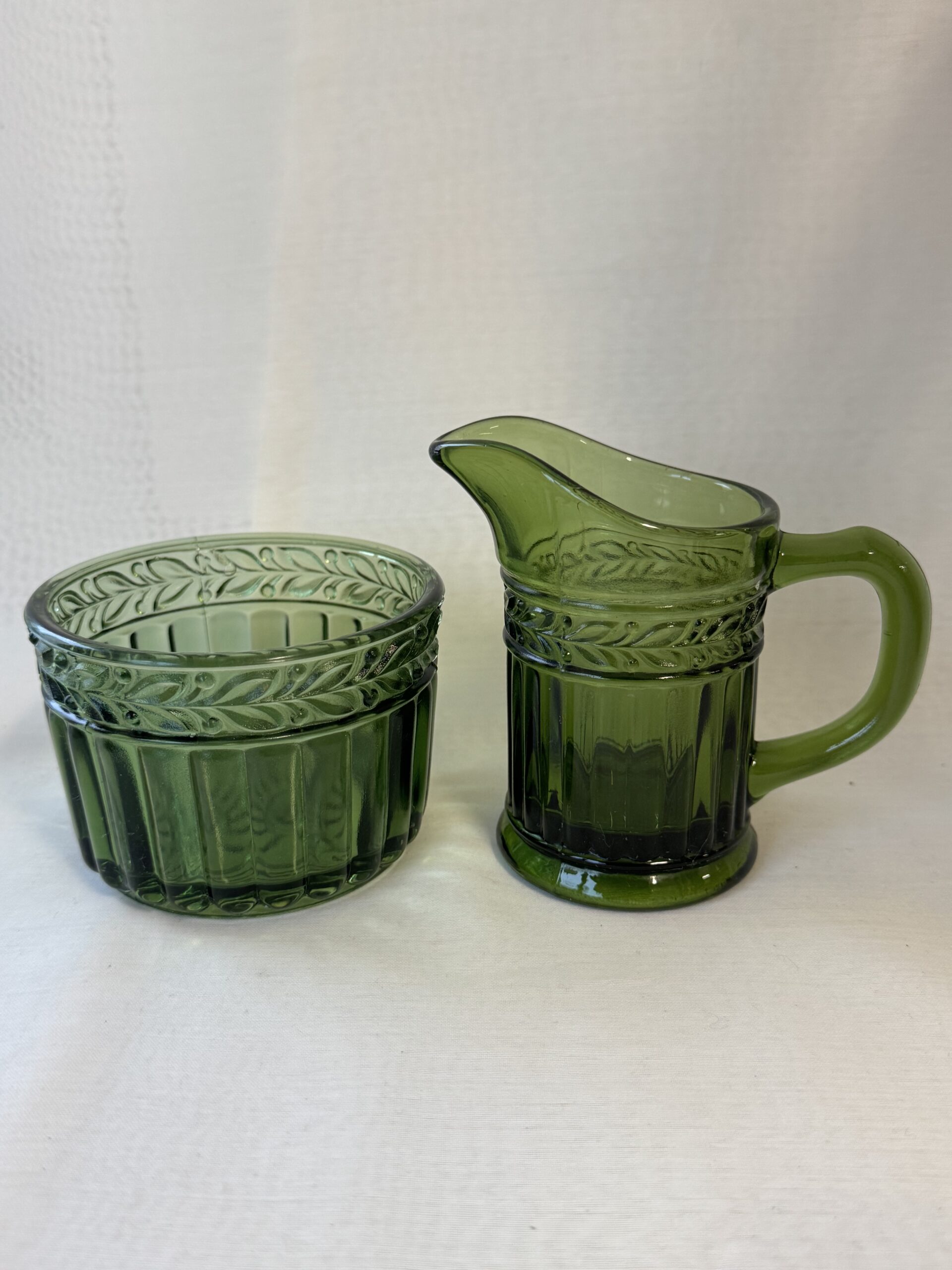 Riihimäen Lasi, Kara sokerikko ja kermakko. Kermakon korkeus 9 cm, sokerikon korkeus 6 cm, ø 9 cm.