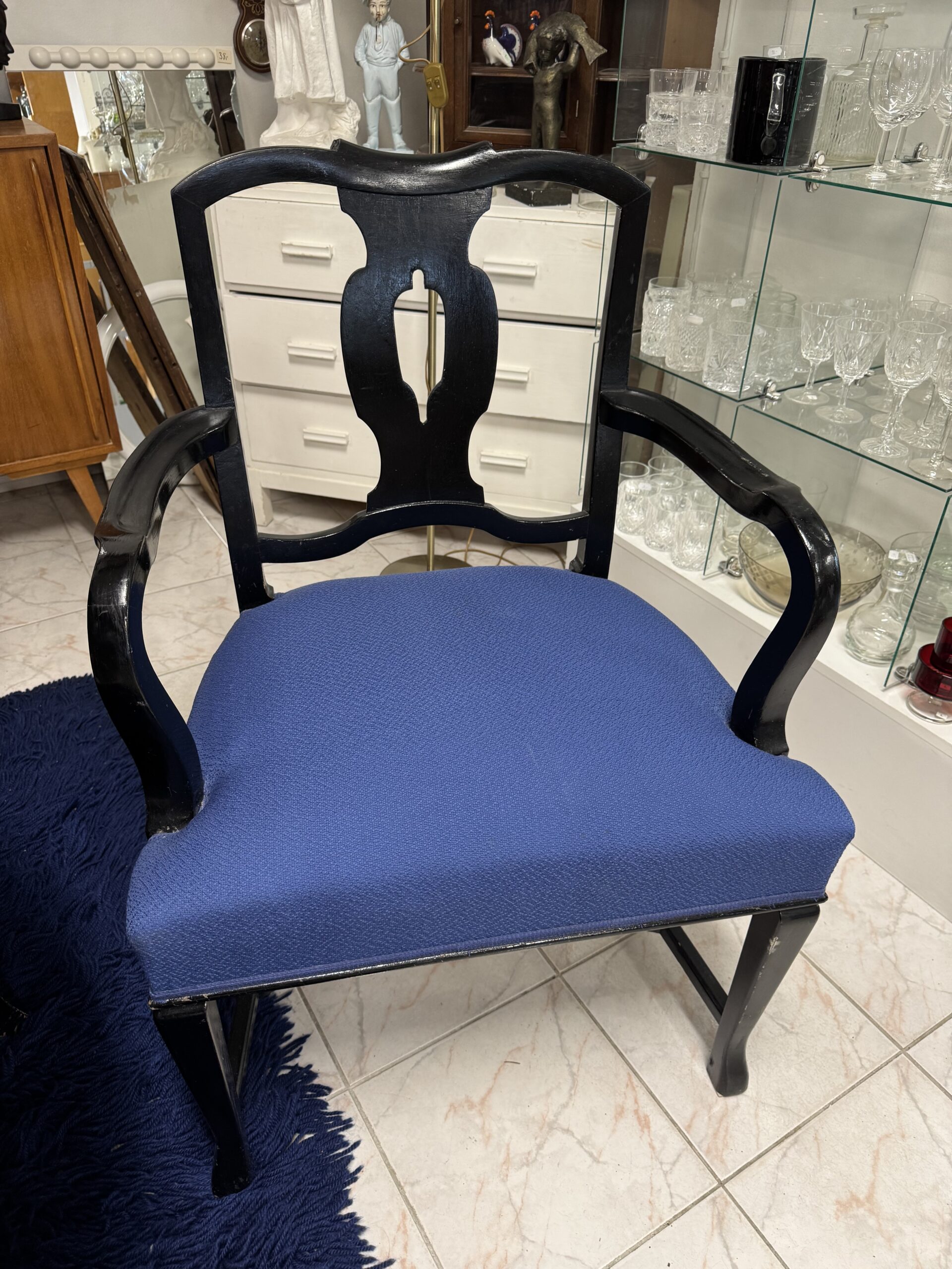 Käsinojallinen tuoli. Ryhdikkäät istua, istuin jousitettu ja jouset tuntuisi ehjältä. Istuinkorkeus 52 cm, istuinsyvyys 50 cm, leveys käsinojista 66 cm.