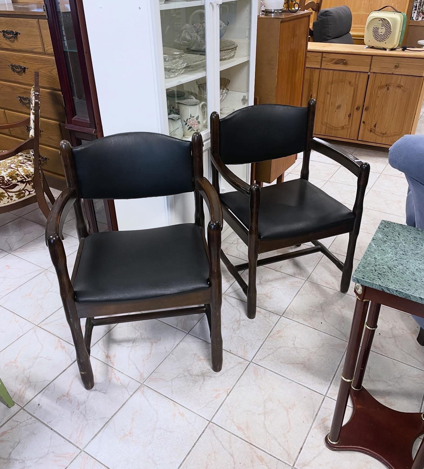 Käsinojallinen tuoli, nahkaistuimet hyvässä kunnossa. Istuinkorkeus 42 cm, eli hieman matalampi kuin ”normikorkeus”.