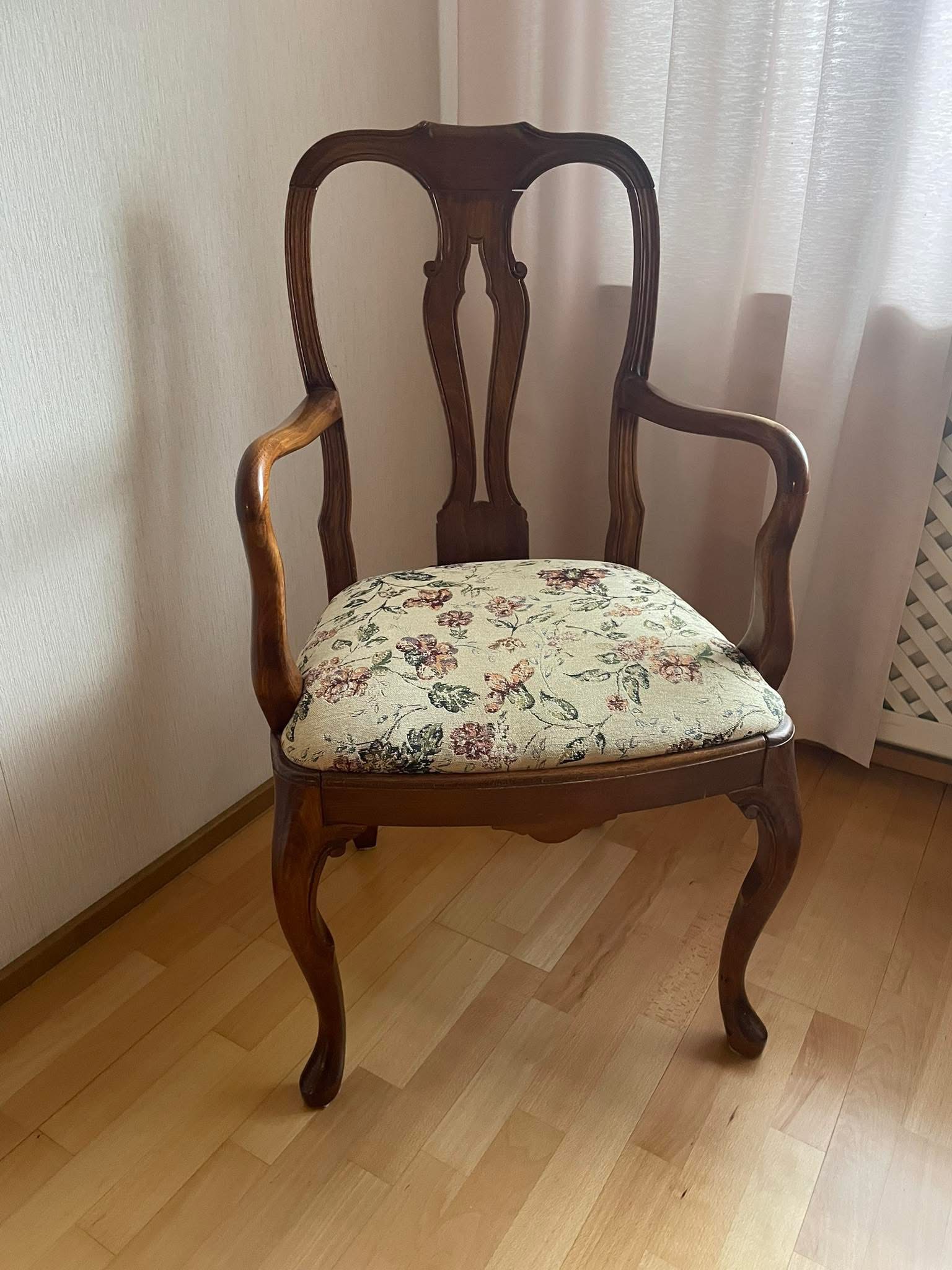Käsinojallinen tuoli, kaunis ja kevyt malli. Selkänojan korkeus 100 cm, istuinkorkeus 50 cm.