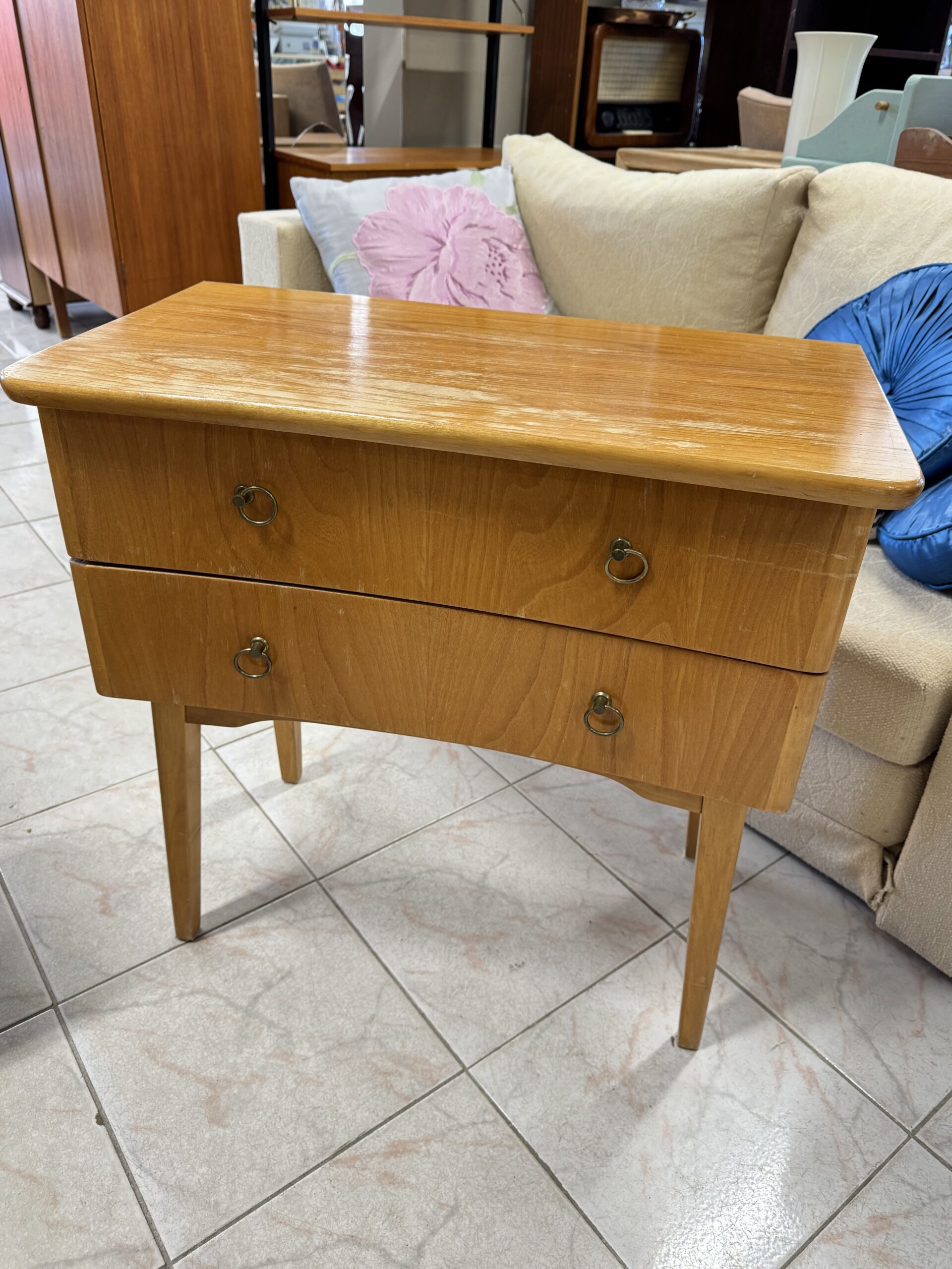 Mitä ihanin koivuinen – jo elämää nähnyt – lipasto, sivupöytä. Vetimet tallessa ja ehjät, pinnoissa kulumaa, ajan patinaa. Korkeus 64 cm, ø 66 x 35 cm.
