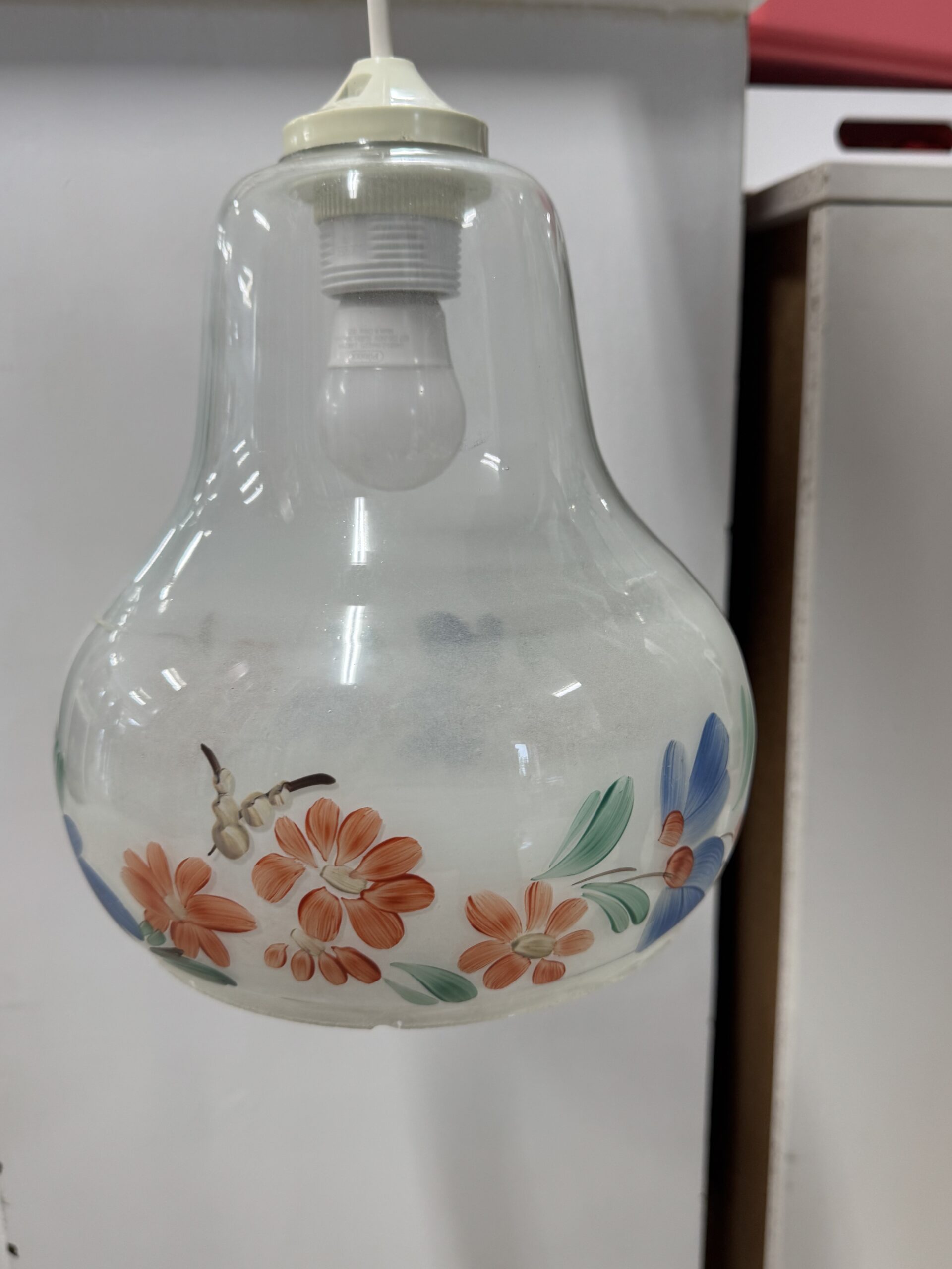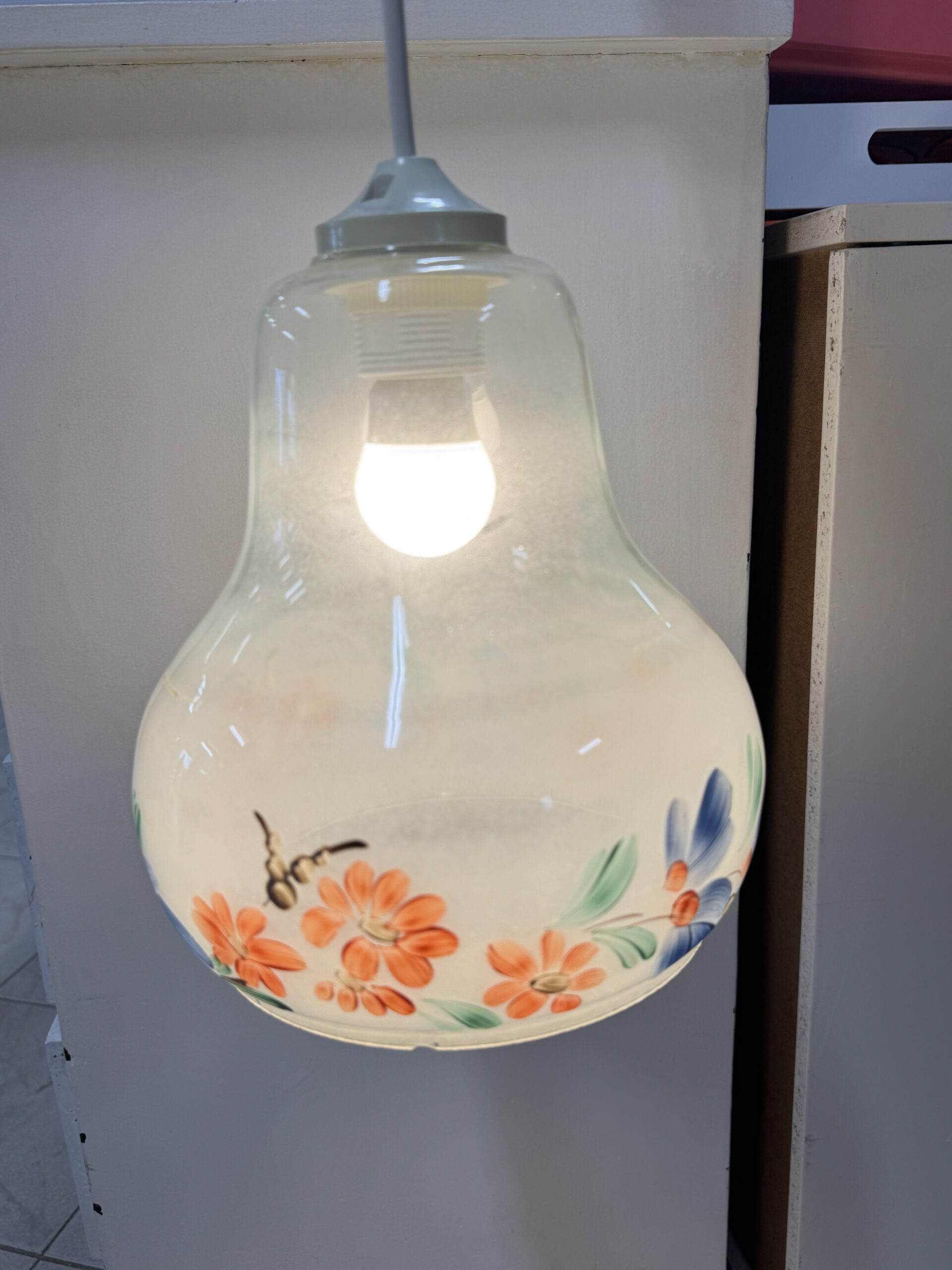 Lasivalaisin, käsinmaalattu koriste todennäköisimmin Kauklahden. Ripustusjohto uusi, jälkiasenteinen. Korkeus 60 cm, josta kuvun korkeus n. 30 cm.