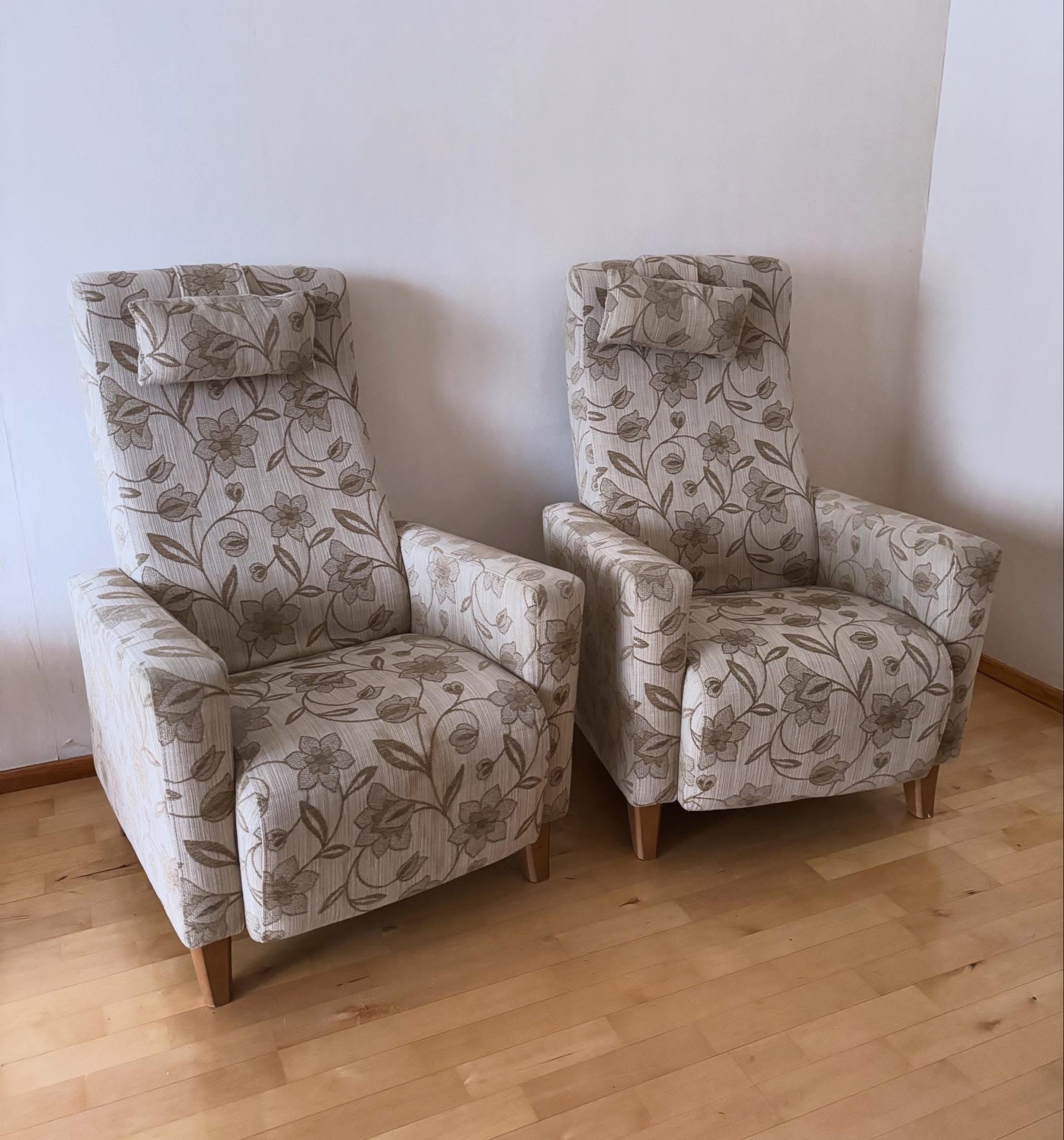 Pohjanmaan kalusteen lepotuolit, mukavat istua. Niskatyynyt irroitettavissa, selkäpuolella tarralla kiinni. Kankaissa istumisen jälkiä, mutta perussiistit. Leveys käsinojista 74 cm, korkeus selkänojasta 106 cm, koko tuolin syvyys 70 cm.