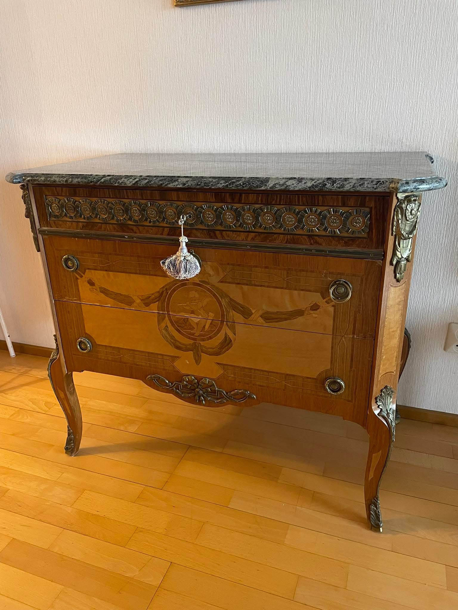 Lipasto kivitasolla, intarsia koristeet ja messinkikoristeet. Yksi vedin erilainen (kuvassa oik. ylä). Leveys 96 cm, syvyys 53 cm, korkeus 82 cm. Kivitaso lähtisi irralleen, painaa paljon.
