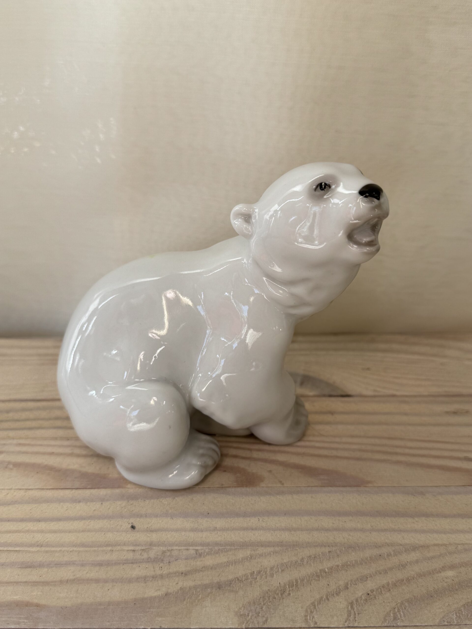 Lomonosov jääkarhu patsas, korkeus n. 12 cm. Pohjassa punainen leima, hieman kulunut mutta tunnistaa Lomonosovin leimaksi.