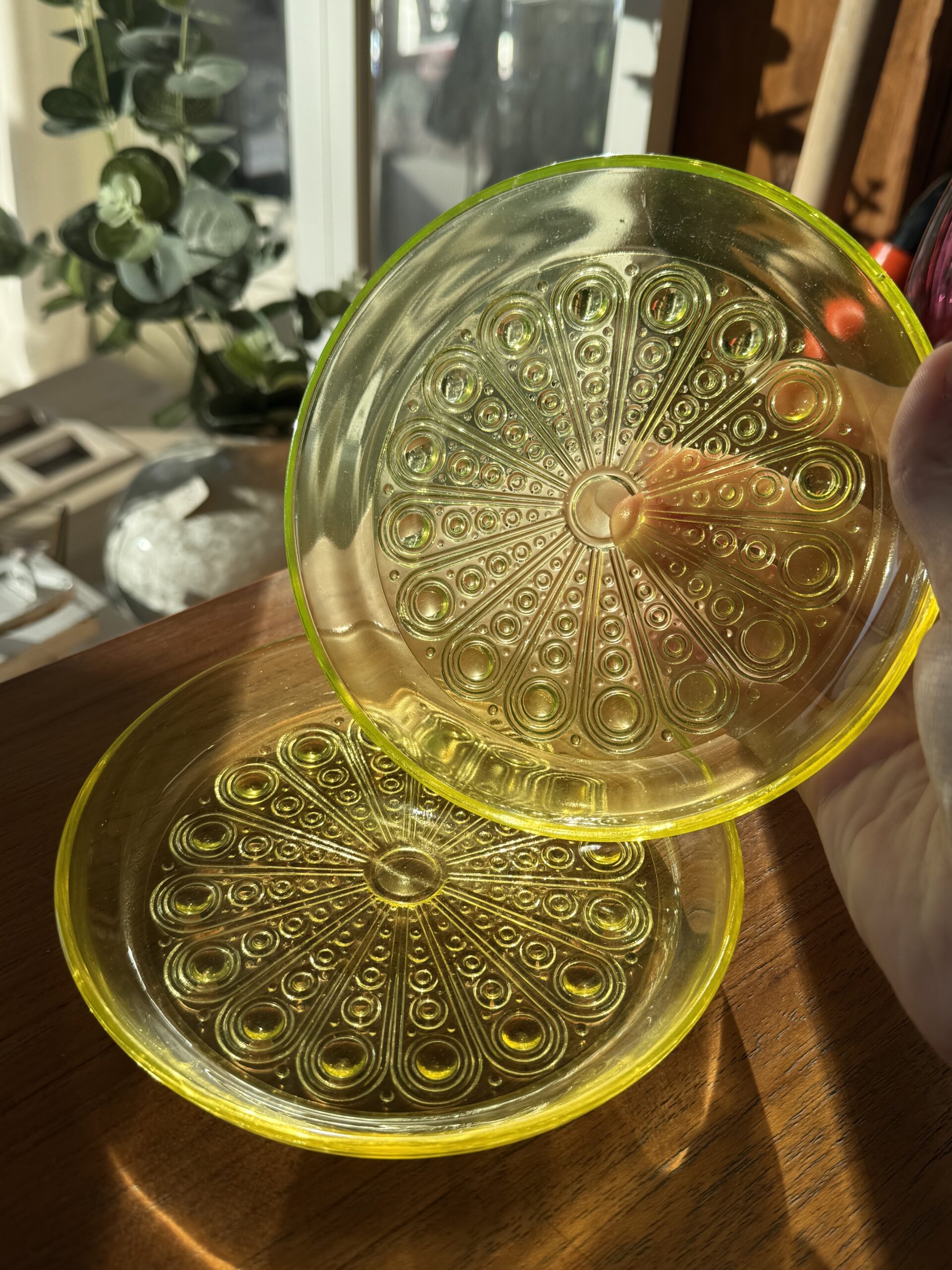 Riihimäen Lasi, Nanny Still, Riikinkukko pullalautanen, ø 14,5 cm. Uraanilasia.