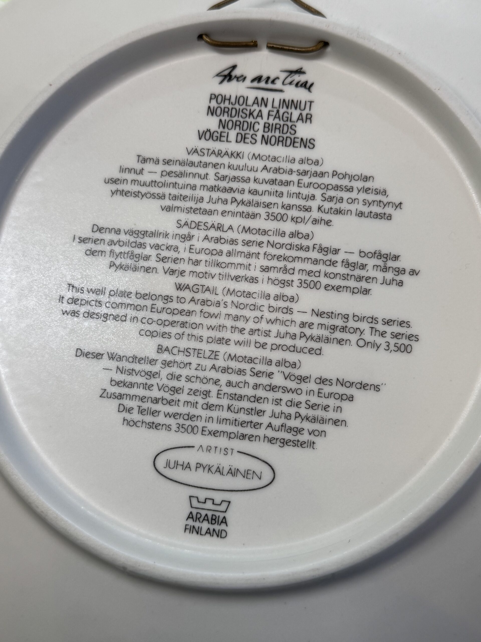 Arabia, Pohjolan Linnut -sarjan Västäräkki seinälautanen. Juha Pykäläinen yhteistyössä Arabian kanssa, rajoitettu määrä sarjan lautasia olemassa. Halkaisija 20 cm.