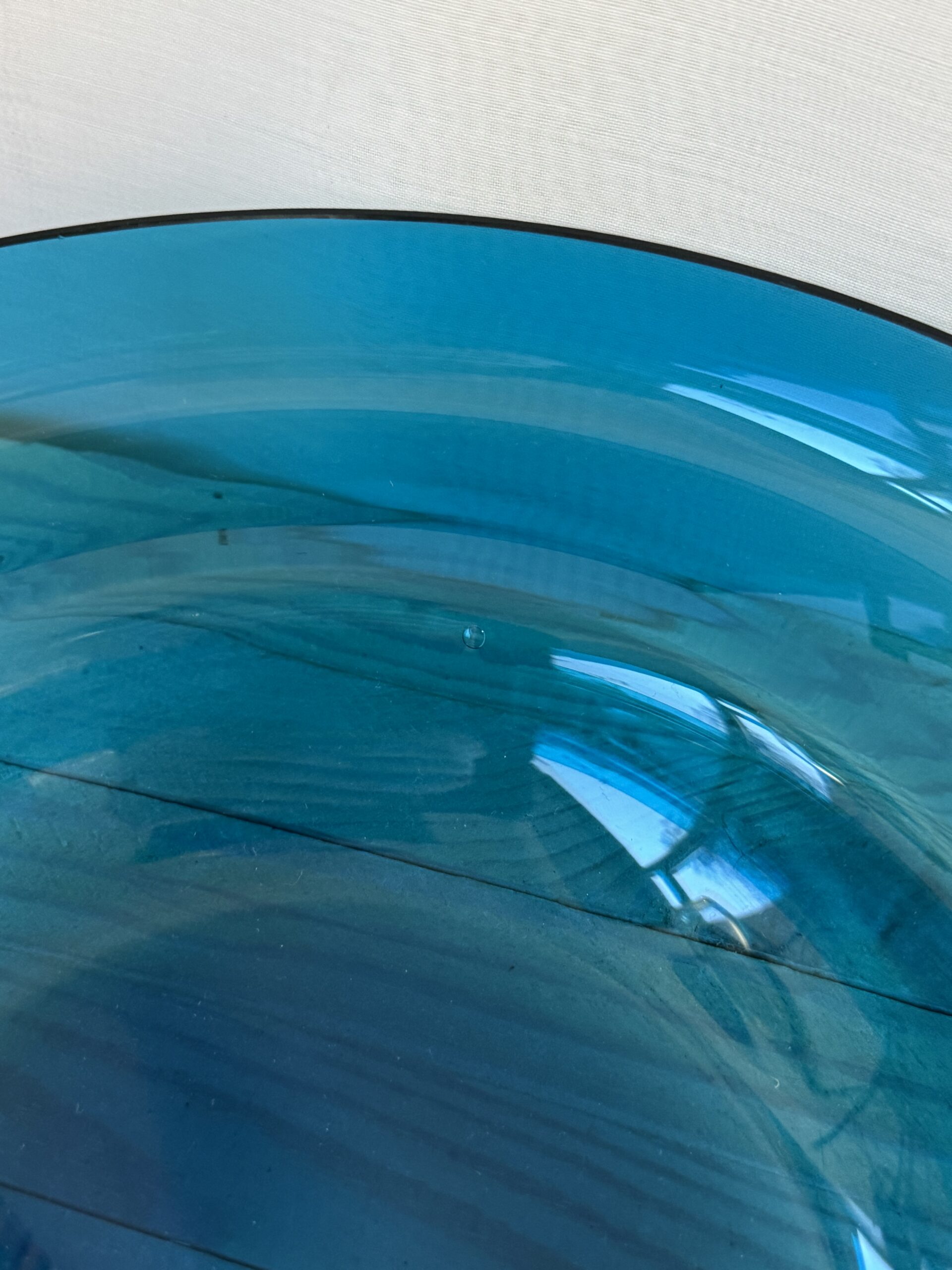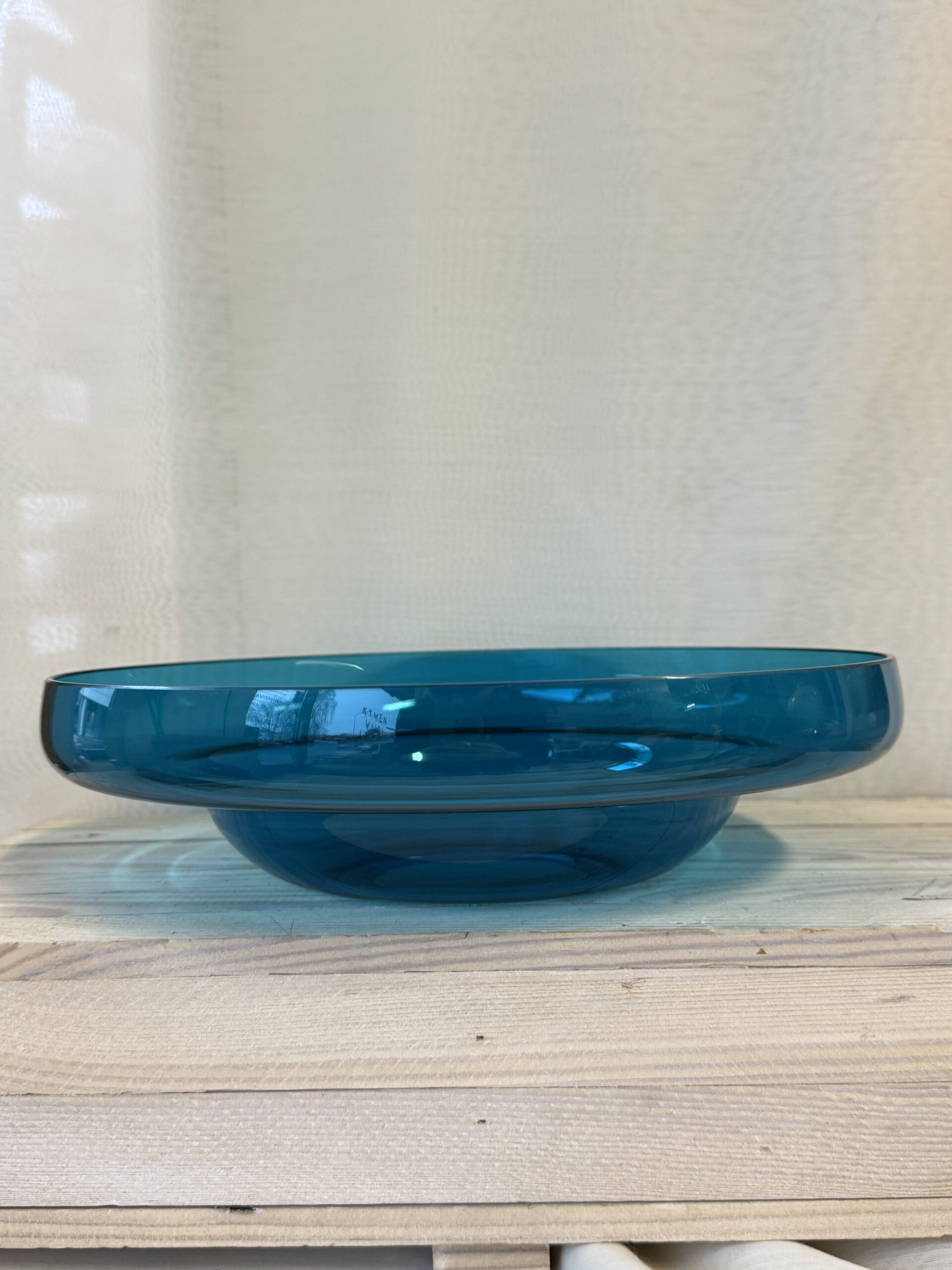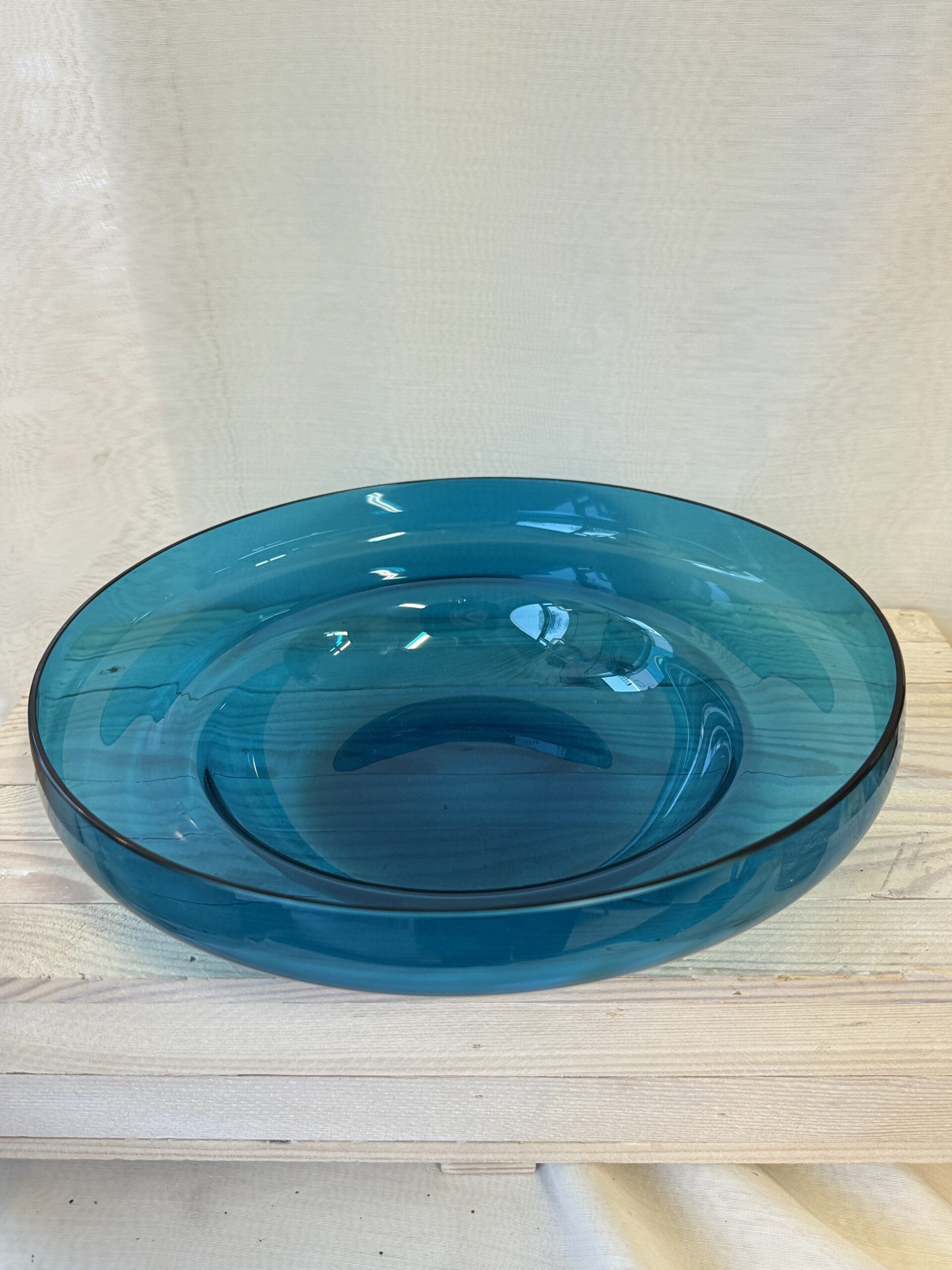 Pomona malja, Helena Tynell. Kaunista ohutta lasia, turkoosi väri. Halkaisija 26 cm. Tekovaiheessa jäänyt kupla lasiin.
