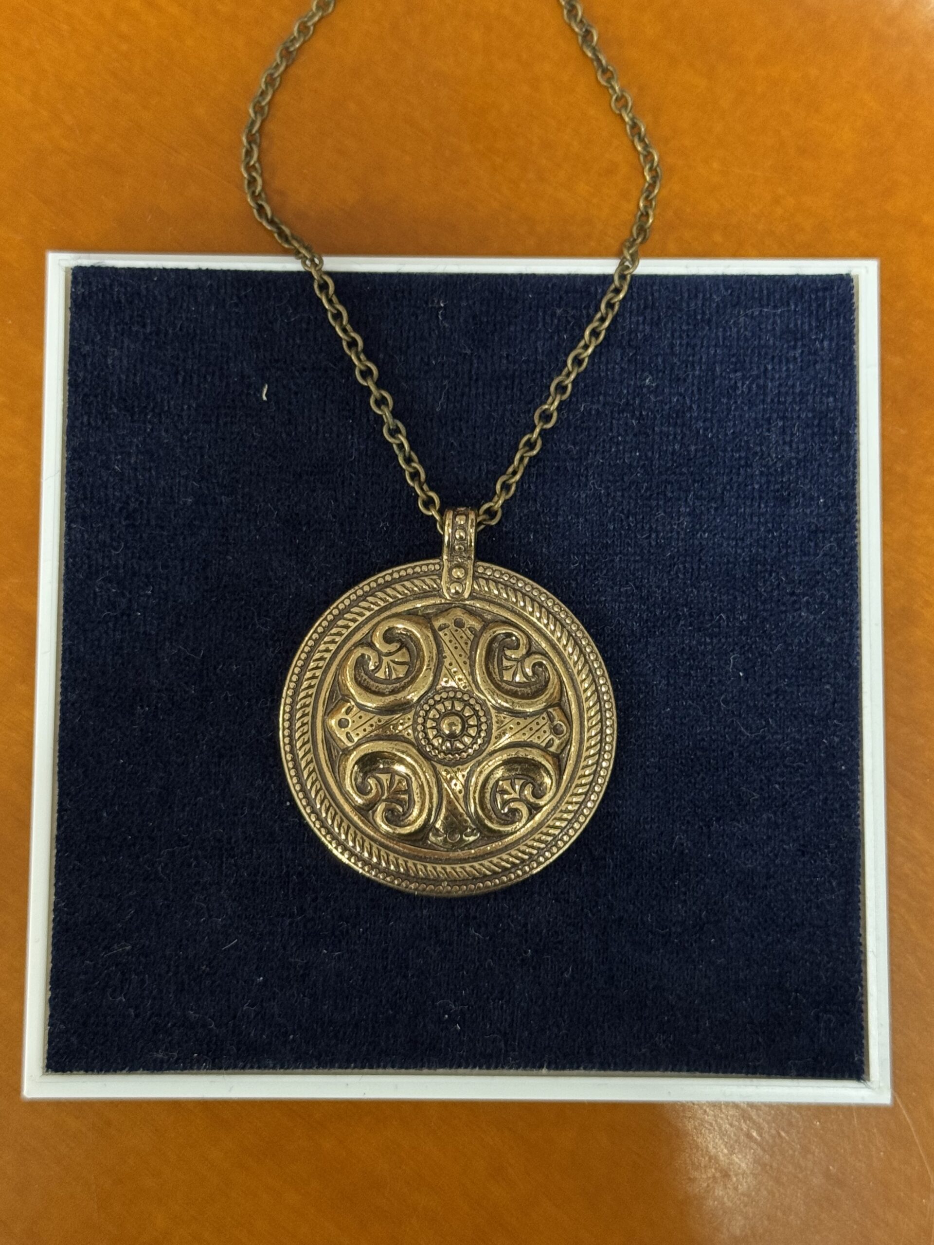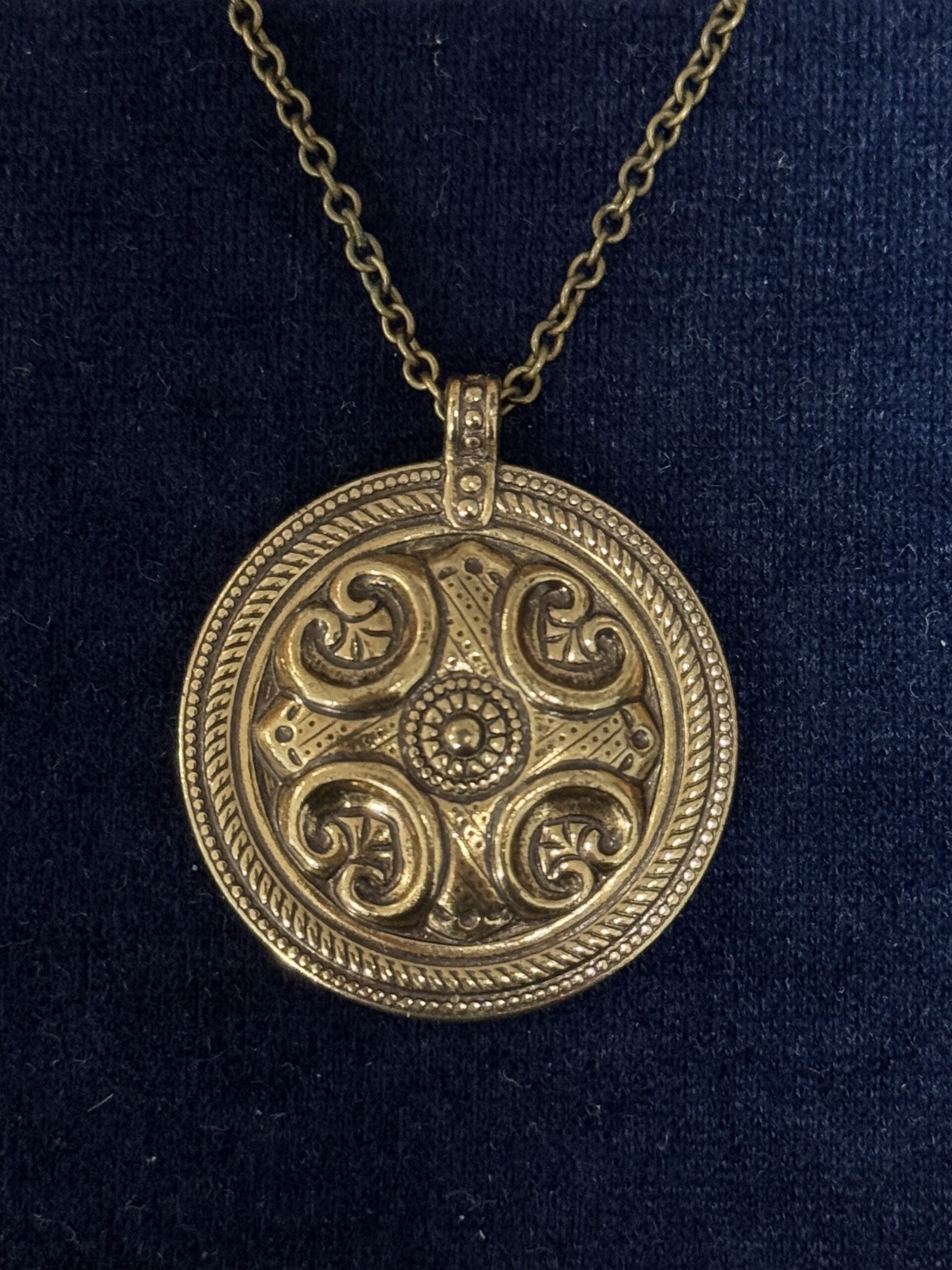 Kalevala Koru, Räisälän riipus, pronssi. Ketjun pituus 60 cm, riipuksen ø n. 3 cm.