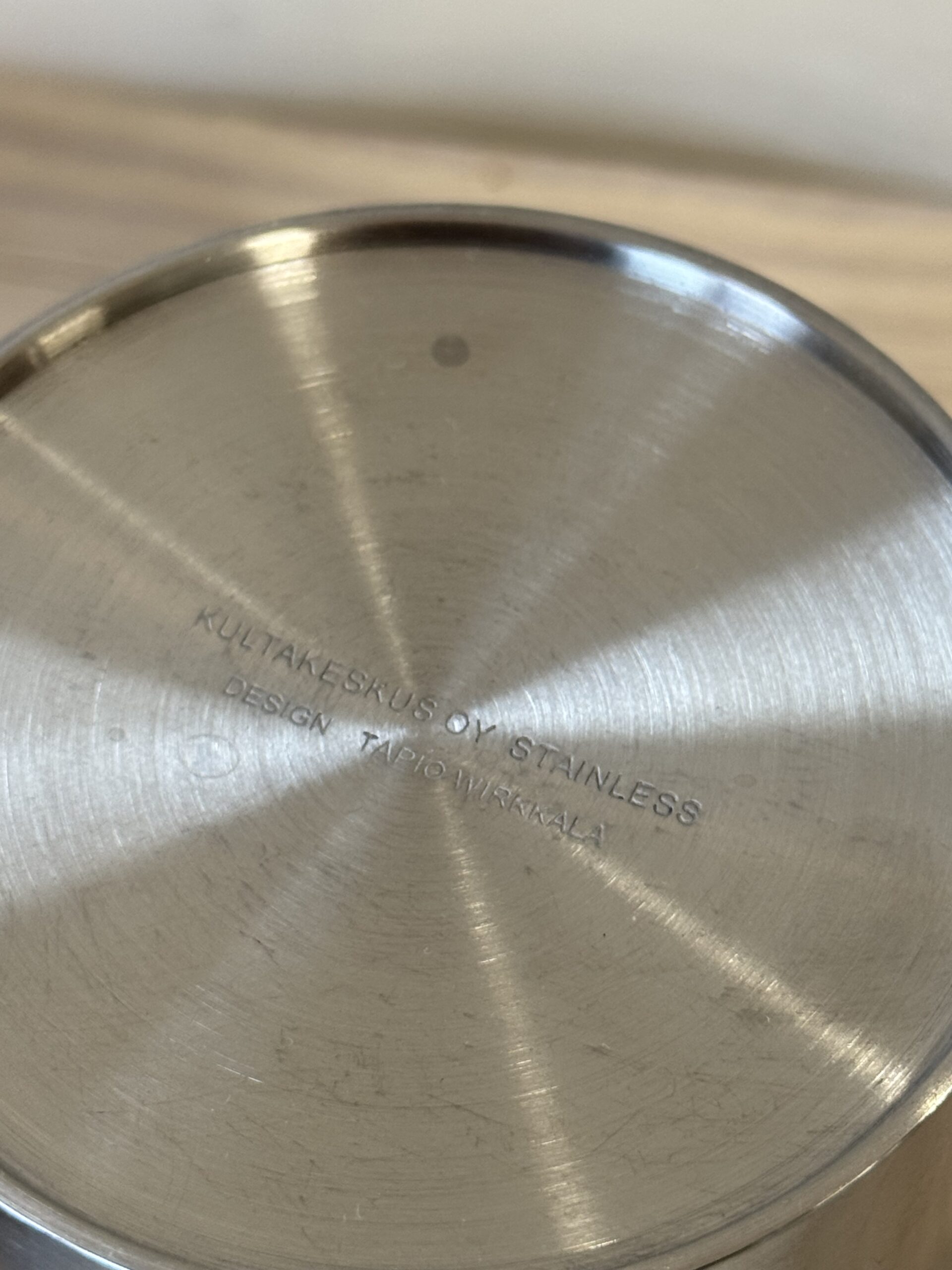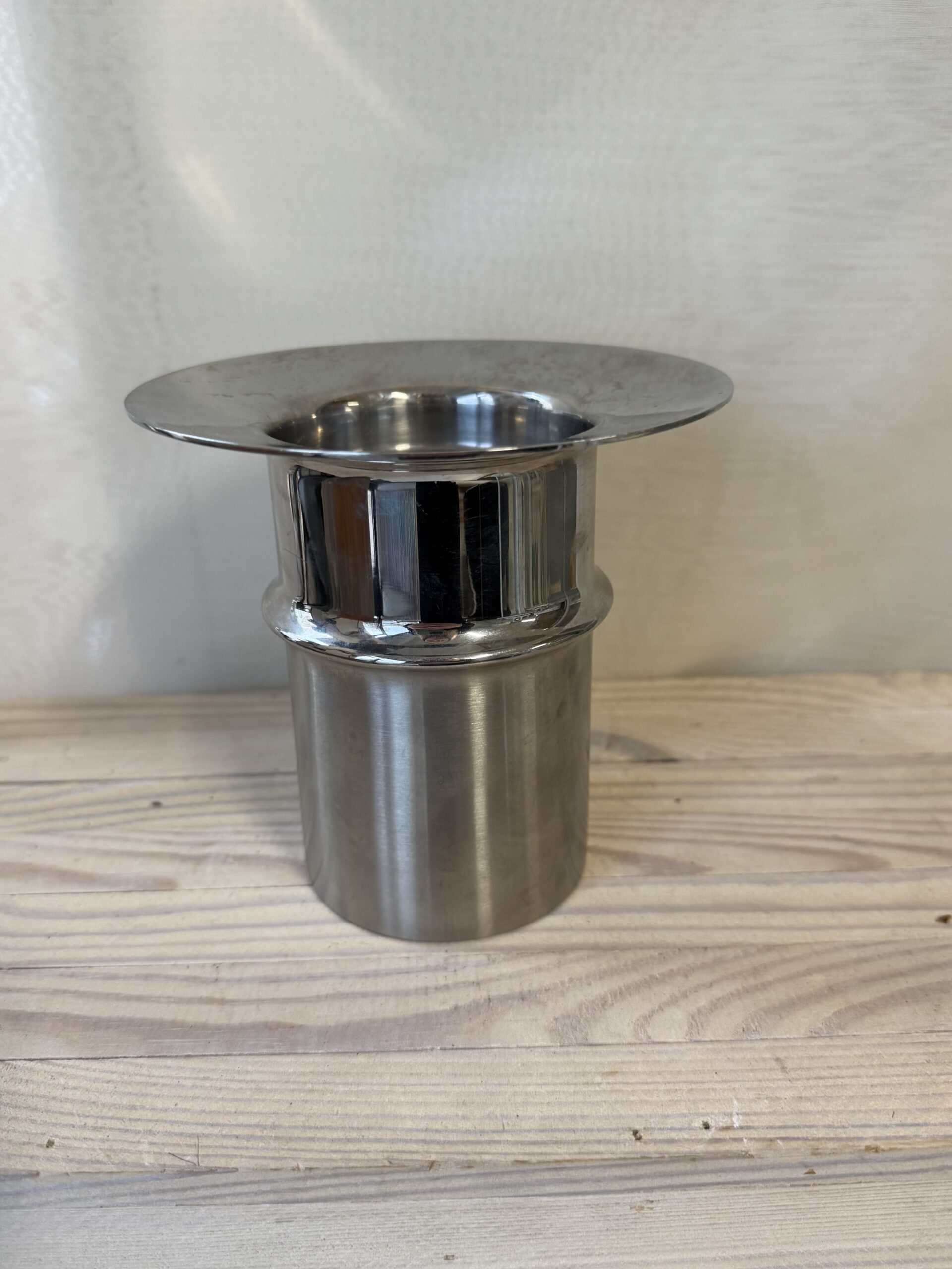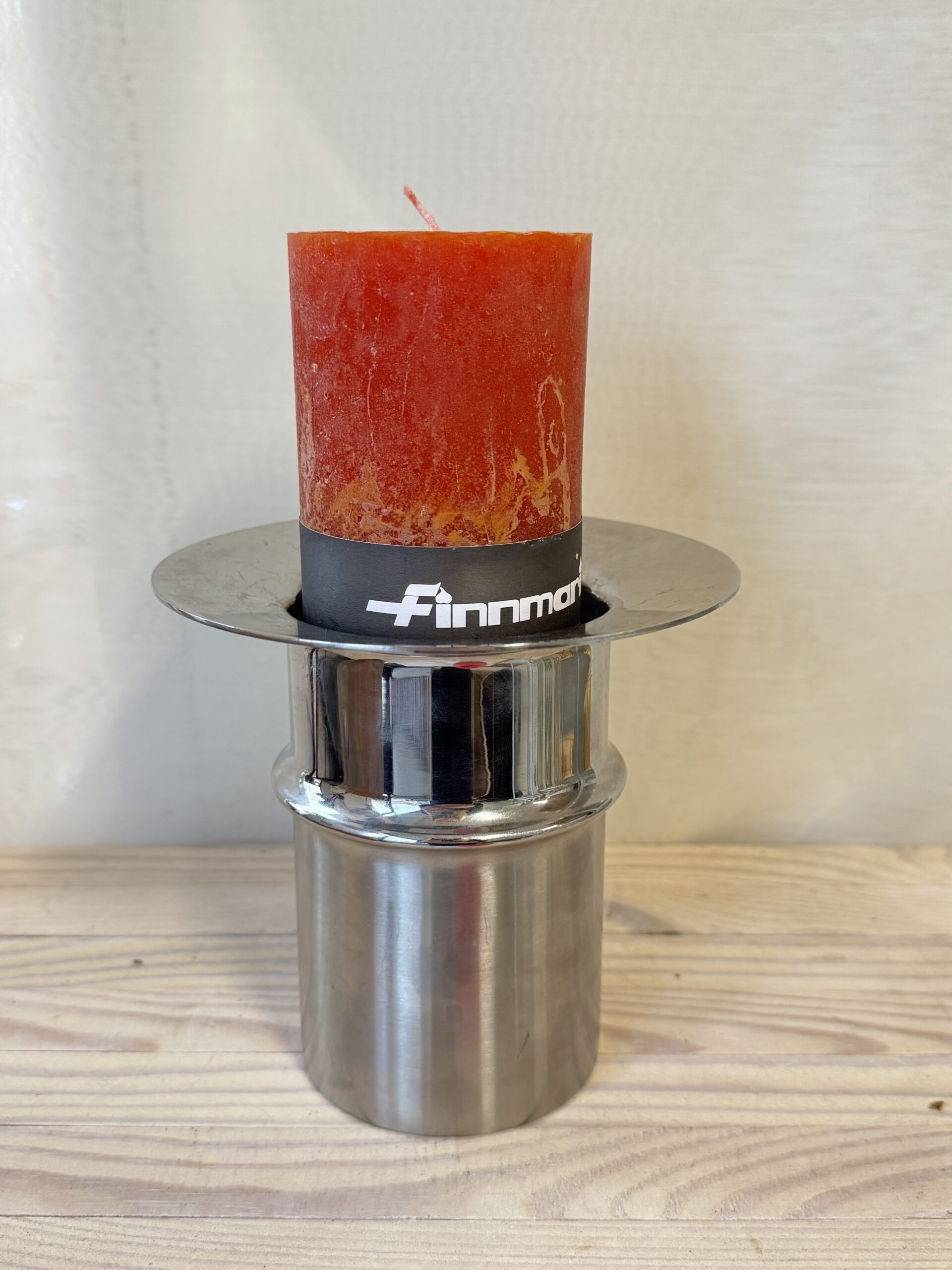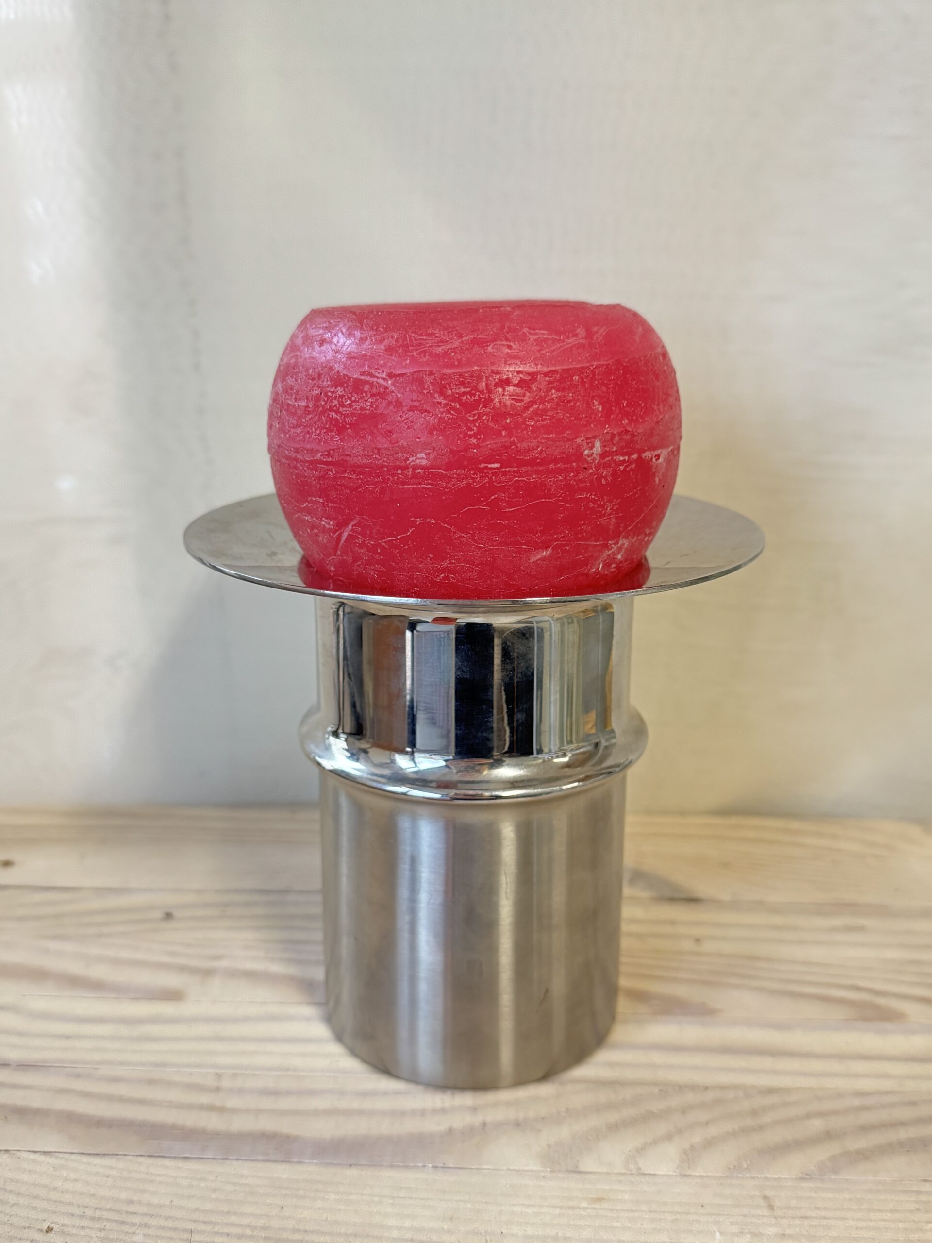 Kultakeskus, Tapio Wirkkala. Teräksinen kynttilänjalka. Yläosaan voisi myös pöytäkynttilän sijasta laittaa pallokynttilän. Korkeus 13 cm.
