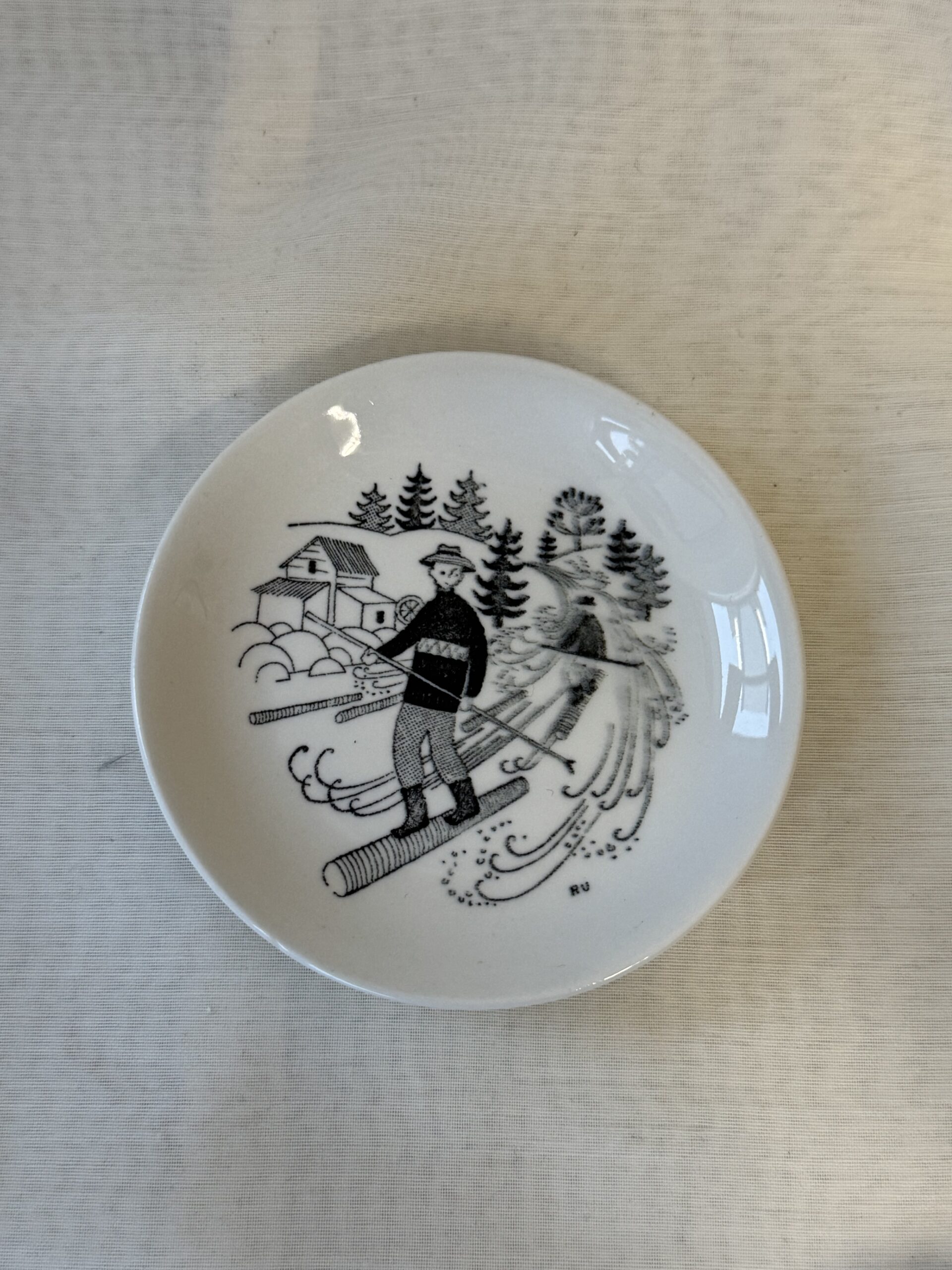 Arabia, Raija Uosikkinen, Tukinuitto seinälautanen. Halkaisija 9,5 cm, koriste hieman ”vuotaneen” näköinen.