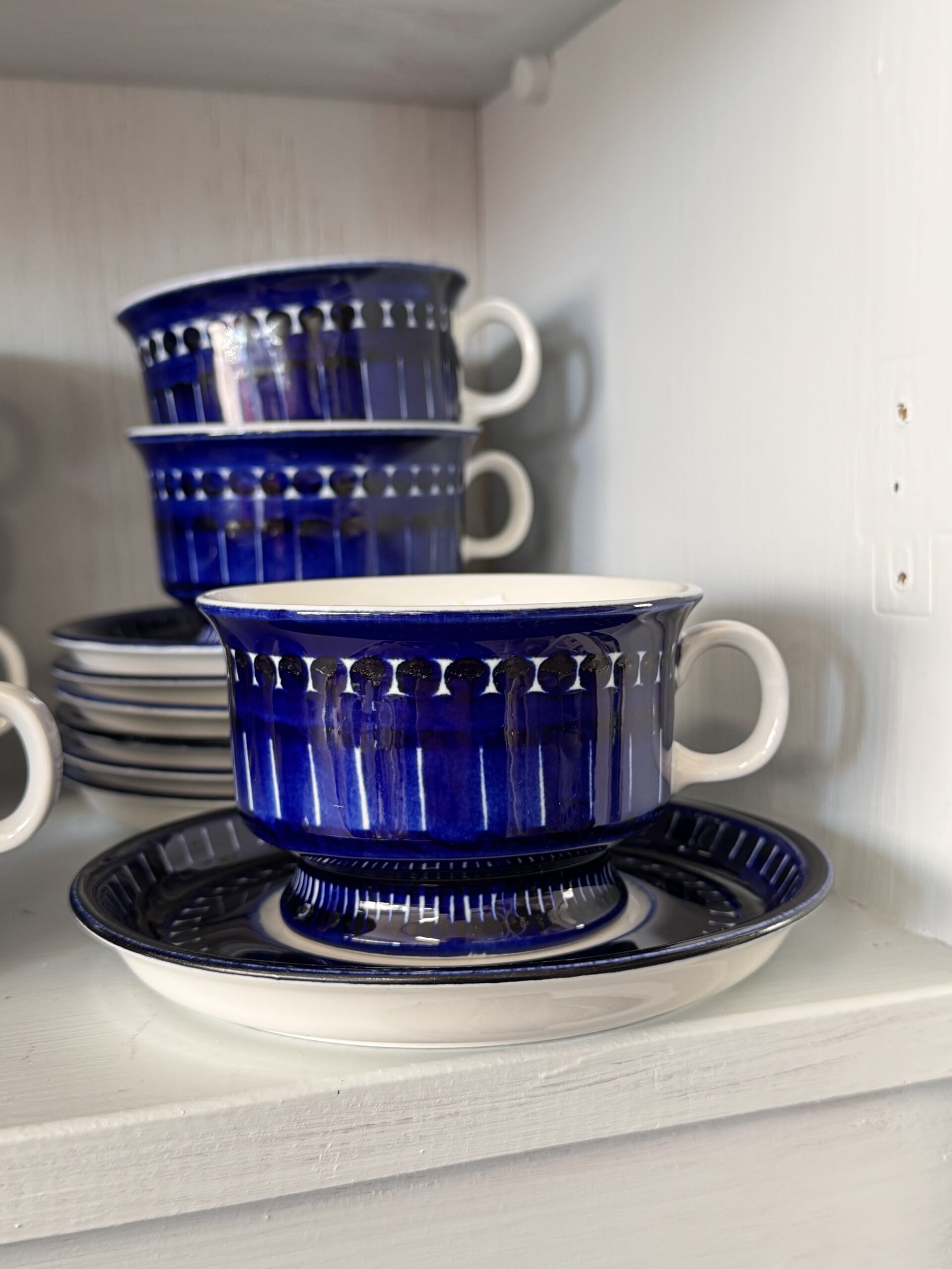 Arabia Valencia teesetti. Kupin korkeus 6,5 cm, ø 10 cm, asetin ø 14,5 cm. Hyväkuntoiset.